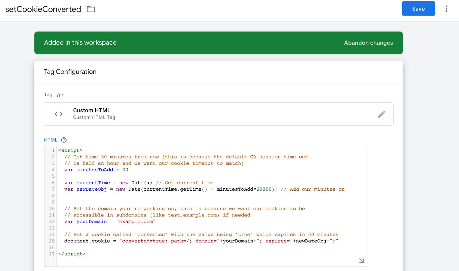 Give the tag the name “[Tag] setCookieConverted” and in the html content paste: