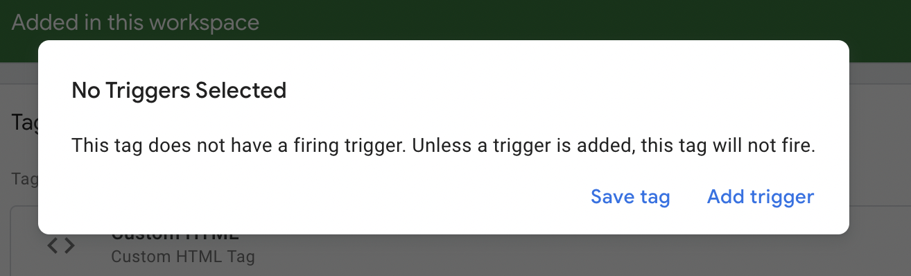 The custom HTML tag will add the content there to the page, and as soon as the page detects a new script (the one we’ve written) it’ll run that script.