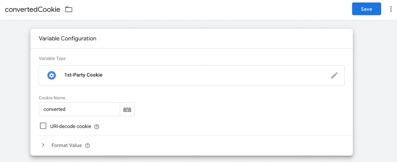Tag Manager has a built-in way to read cookie values using variables. So go to the variables section, create a new variable called “convertedCookie” and set the Cookie Name as “converted”.