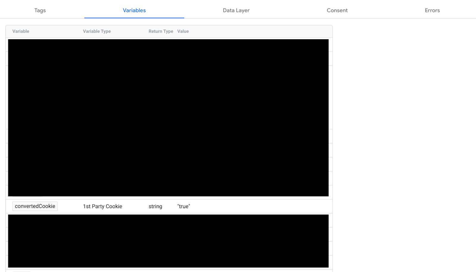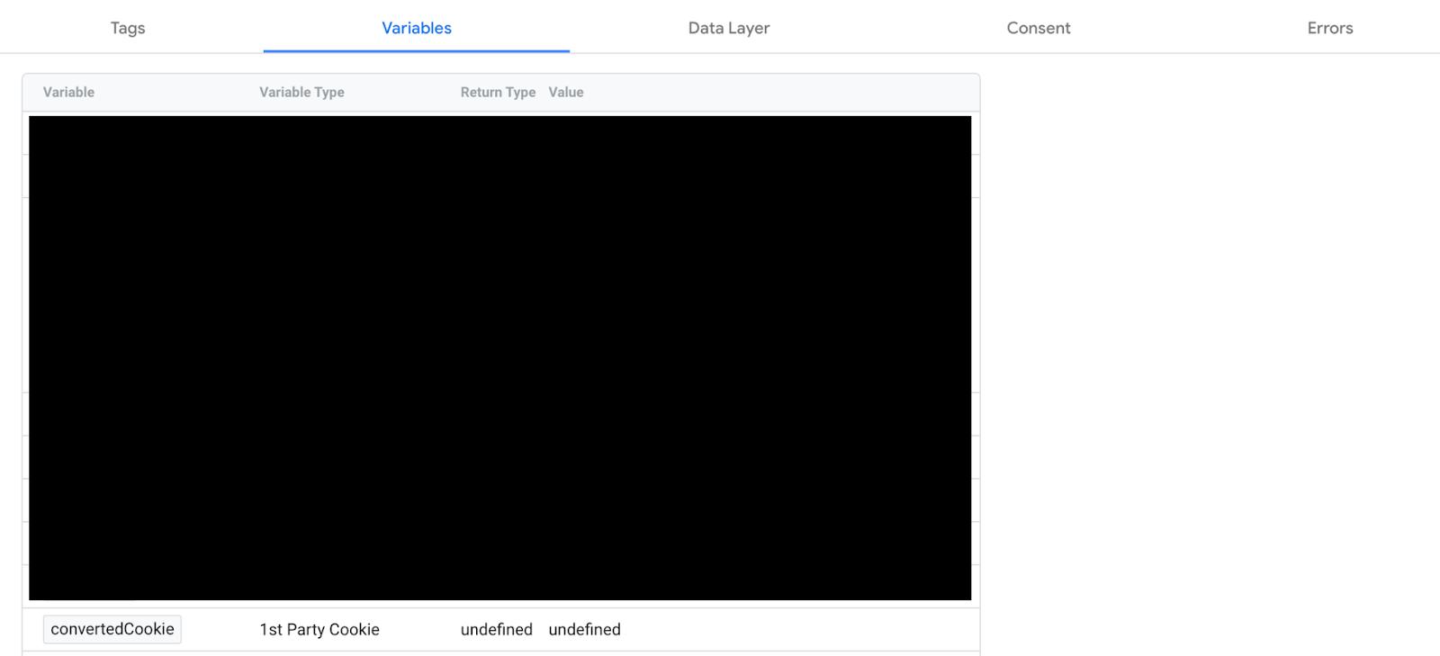 Click into the “Variables” tab and you should see convertedCookie somewhere in the list. Here’s an example with other cookies blocked out so you know what to look for.