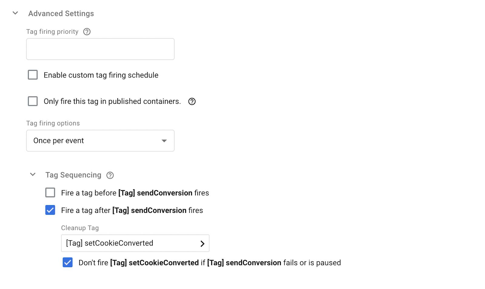 Then we go to whatever tag we’re using to send our conversion, open up “Advanced Settings”, click “Tag Sequencing” and select “Fire a tag after”.