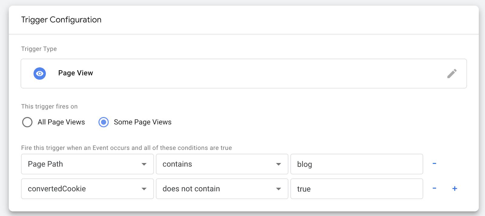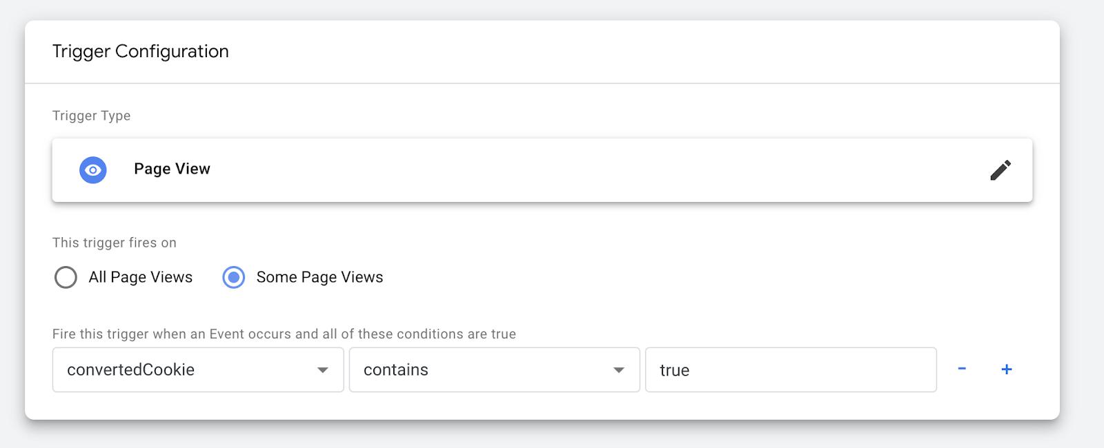 In the new trigger, we set it to fire only on page views where convertedCookie contains true.