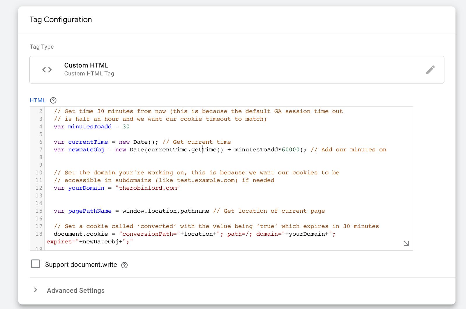 Create a new Tag called [Tag] setCookiePath, choose “Custom HTML” and add the following JavaScript