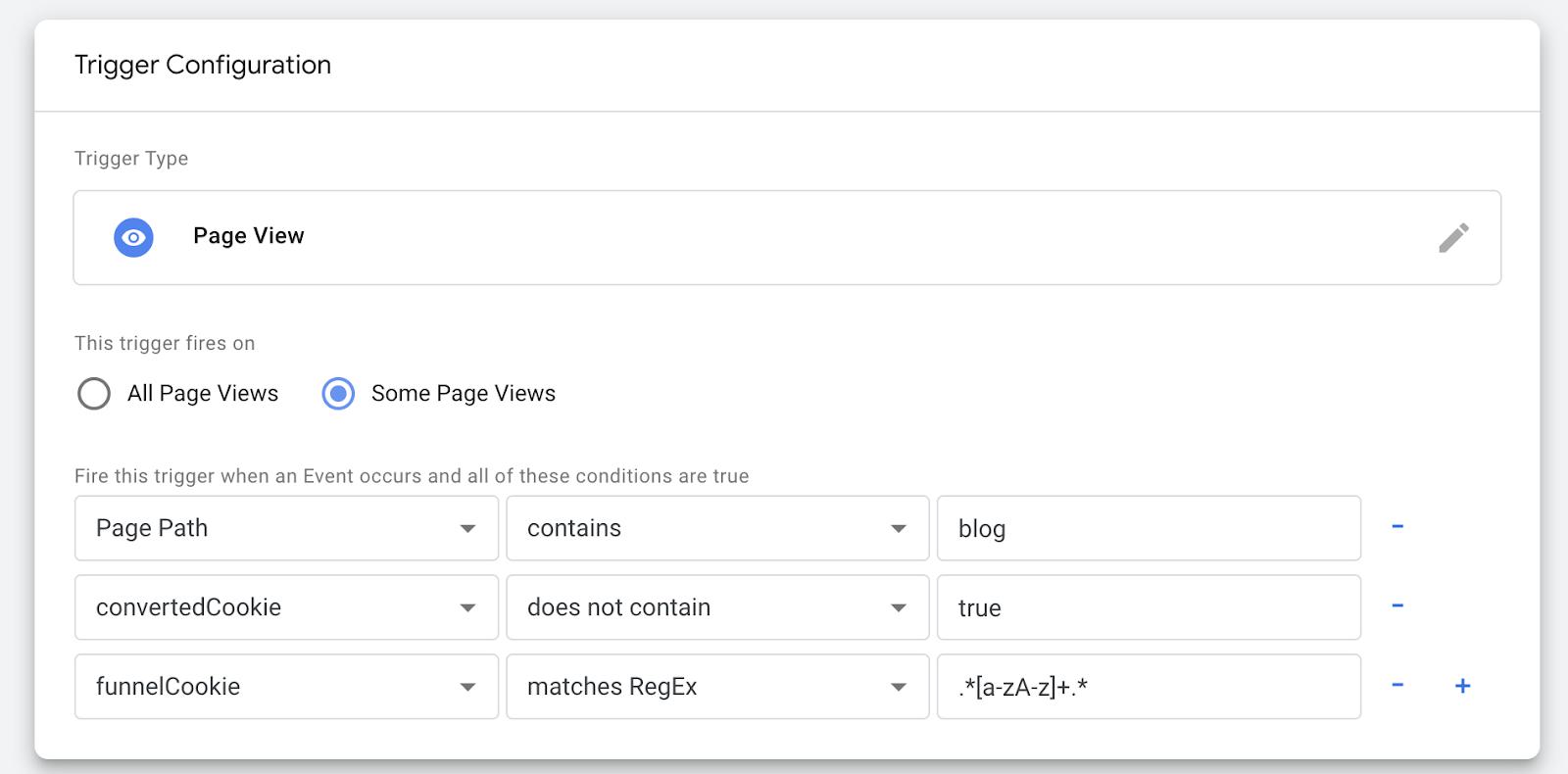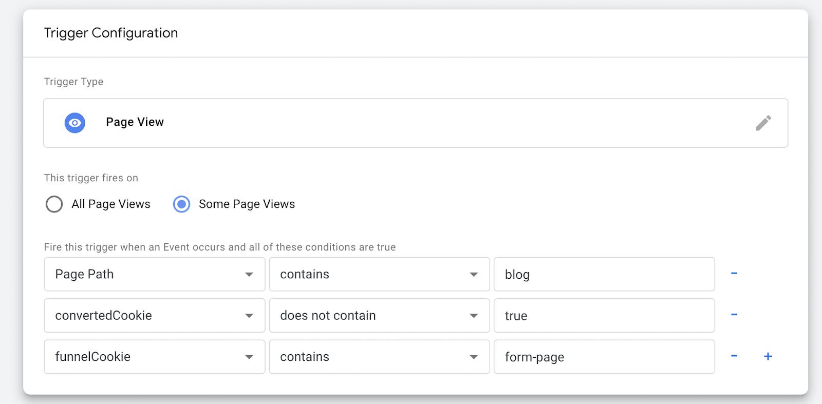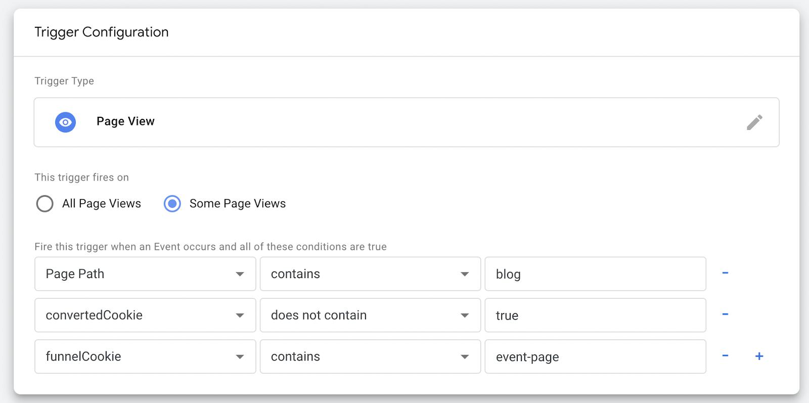 After this we can duplicate this trigger, our conversion tags, and, for our other set of conversions, change the funnelCookie value for the trigger.