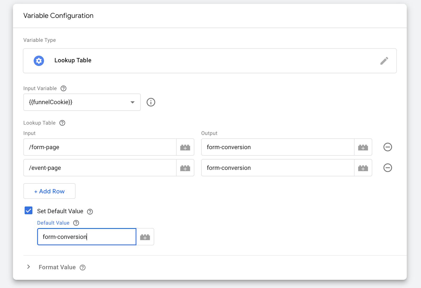 While I can’t take you through the process of updating all of your conversion tags, one option to make this information more ready for filling out conversion tags (and to optionally set a fallback in case you want to avoid losing conversions) is to use a lookup table like this, where you take the funnelCookie value and categorise the values.