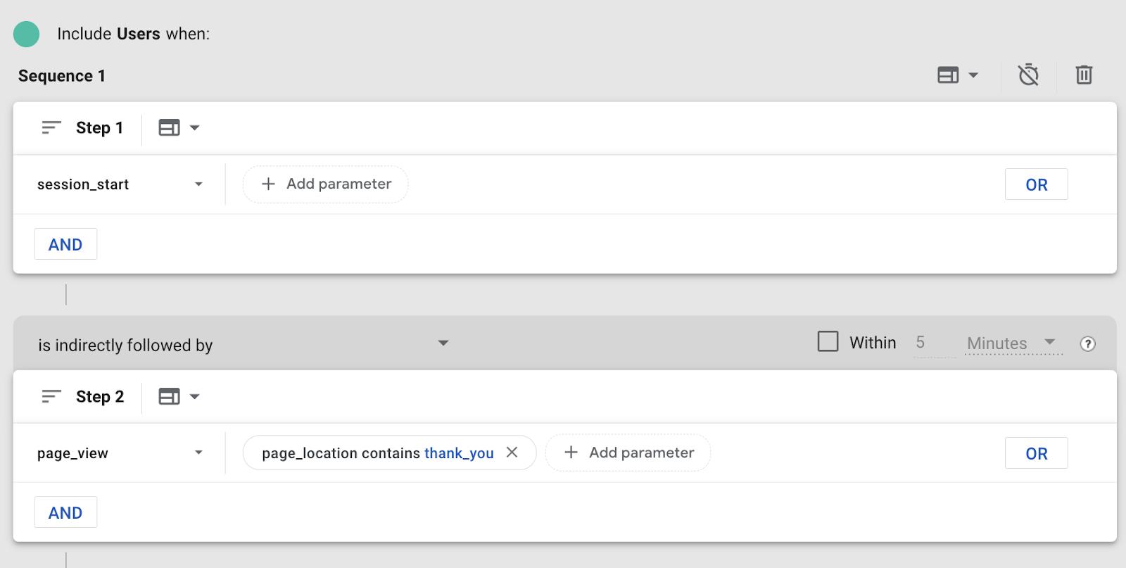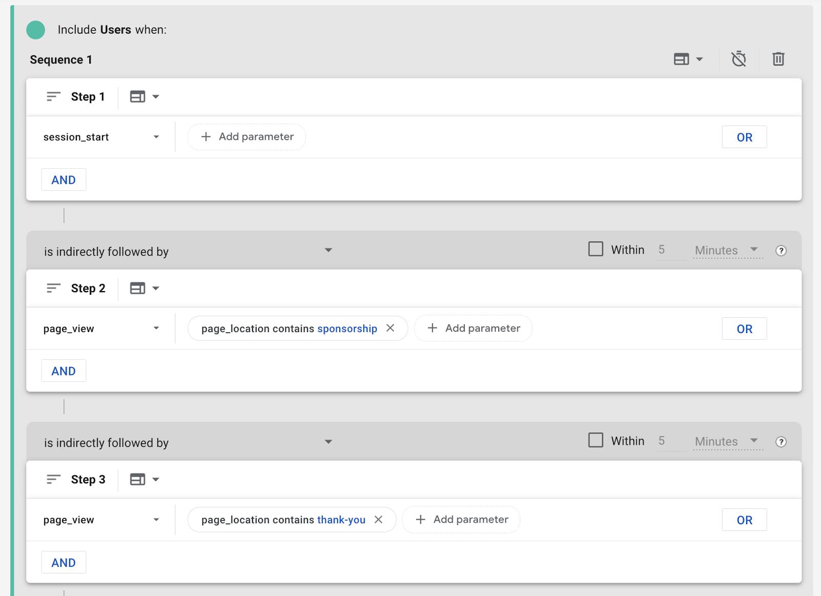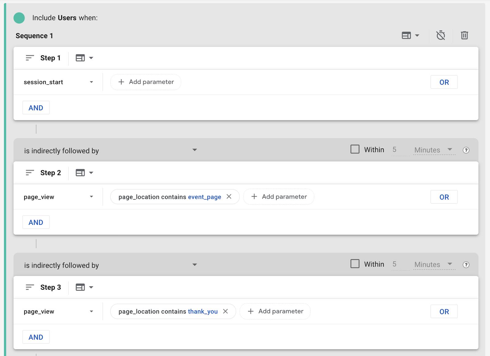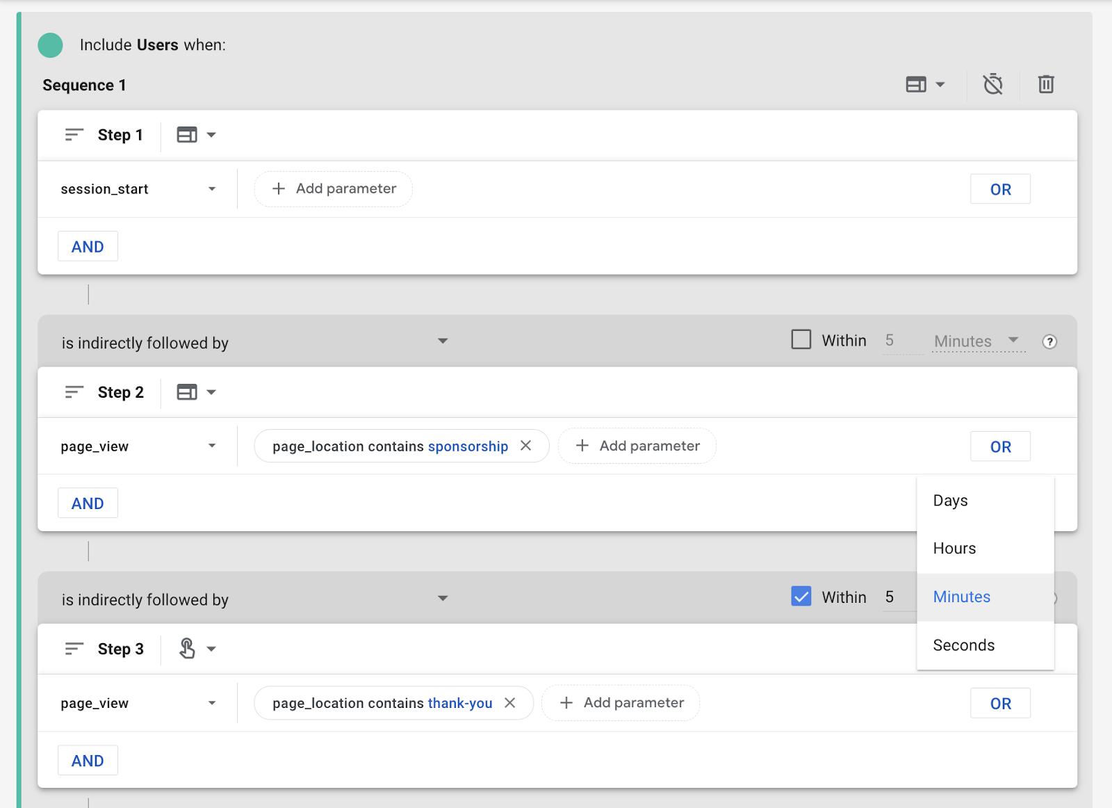 GA4 has a really cool feature in the sequence builder where we can set a timer in-between steps. Even outside of tracking conversions within a session we can use it to keep track of cool things like people who came to our site, didn’t convert that time, but came back and converted within the next couple days.