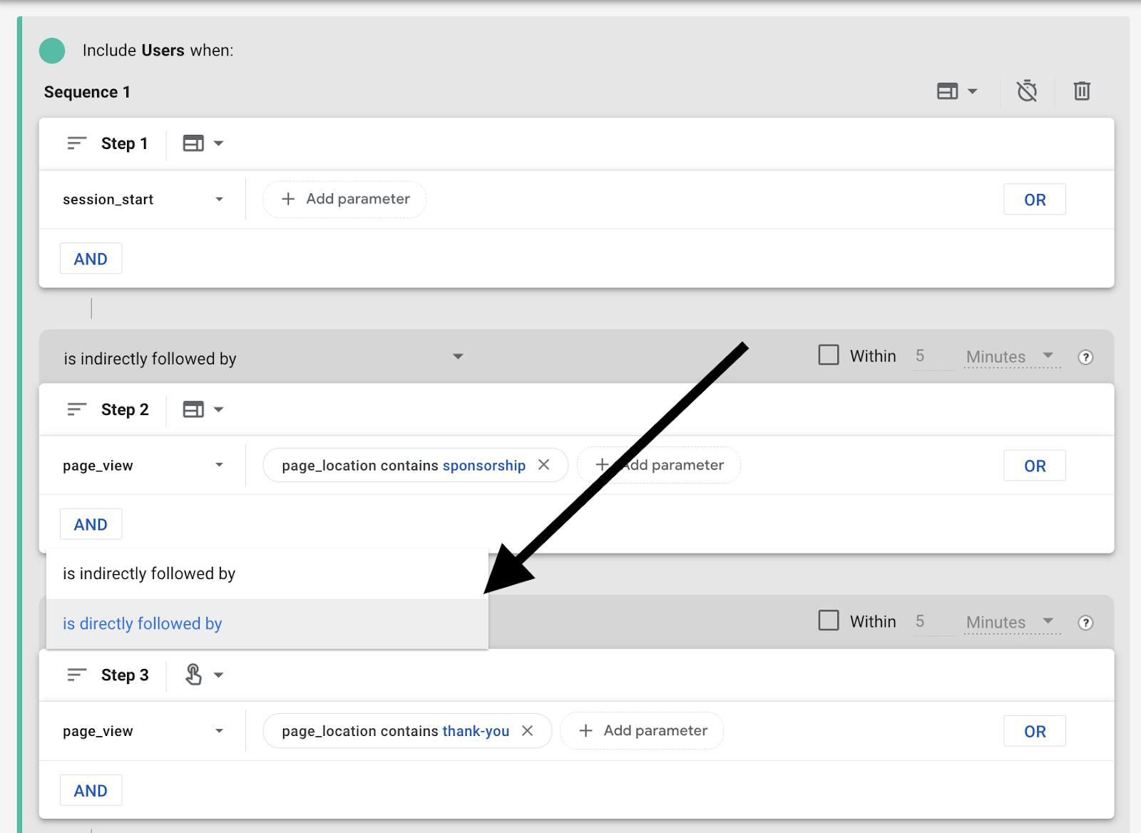 To recreate the goal funnels you might be using in Universal Analytics - we can just add another step to the sequence. For instance: