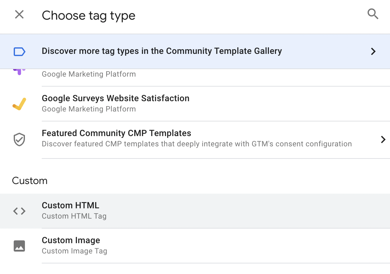 So first: Go to Google Tag Manager, create a new Tag and select the Custom HTML type
