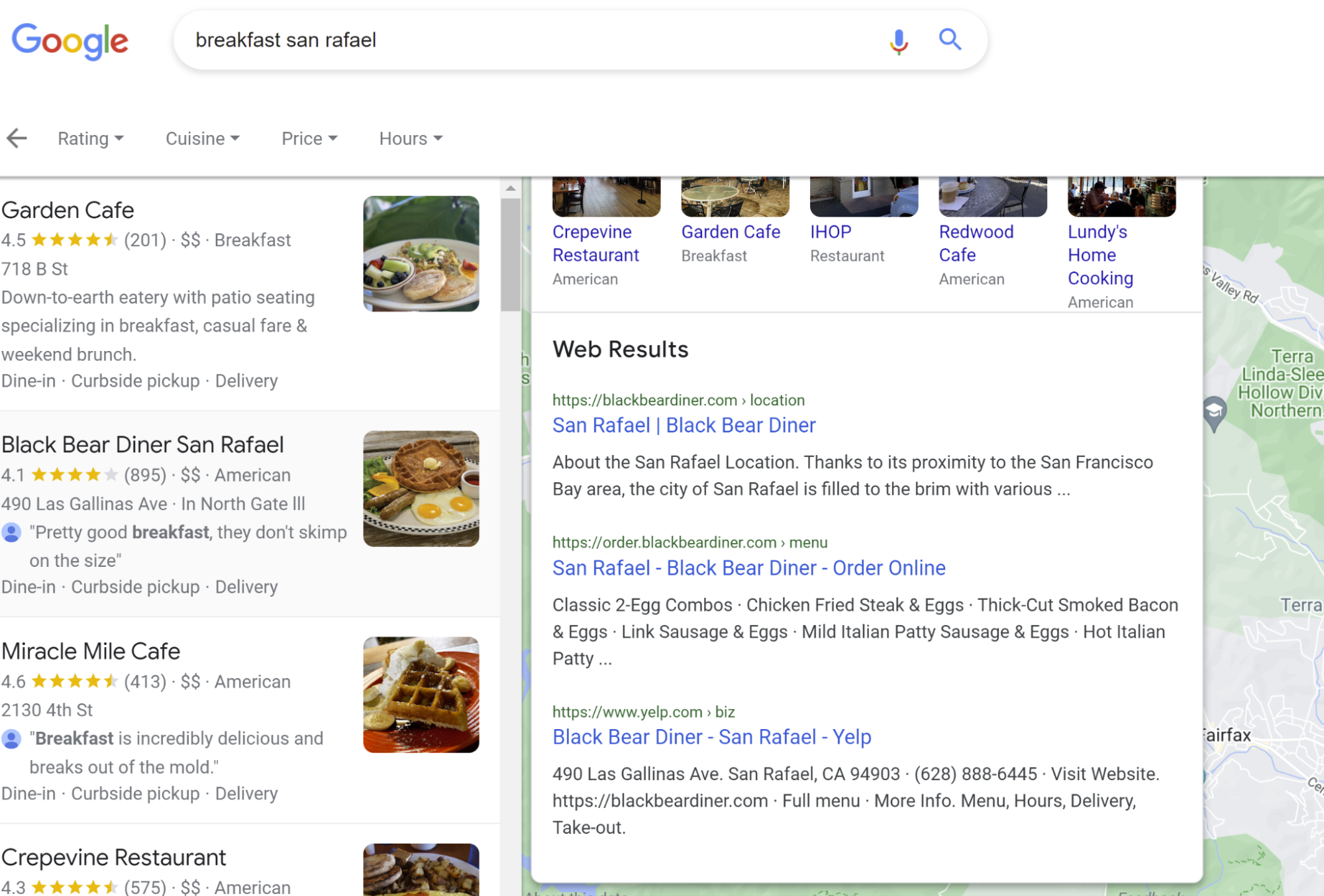 Now that you’ve filled out the name field of the business you’re marketing and its top competitor, evaluate how the actual words in the name could be impacting rankings. Google has historically given a ranking boost to businesses with names containing keywords. For example, if our search phrase was “Breakfast San Rafael”, then a business named “Delish Breakfast” or “Good Morning San Rafael” might have some advantage over one named “Joe’s Place”.
