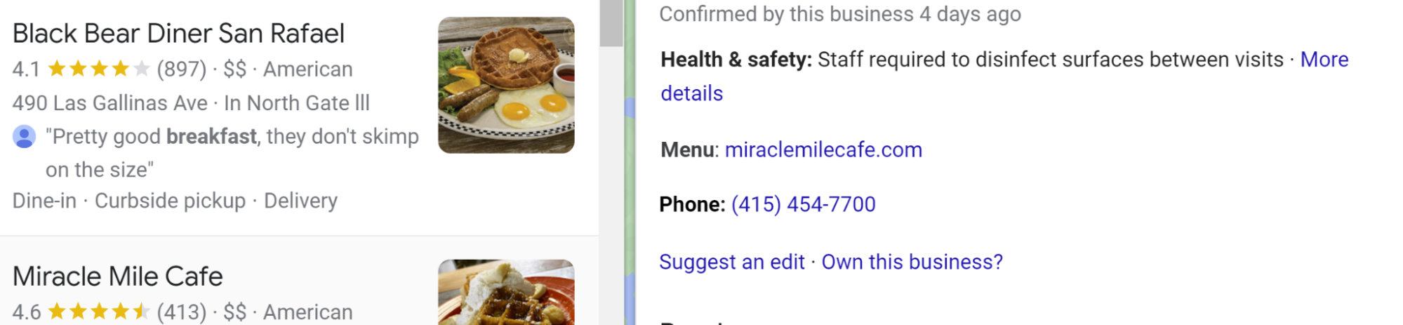 Next, note whether either business has taken the time to enhance their listing with a menu, be that a traditional restaurant menu or a menu of services. In the case of the former category, I also like to record the URL that the menu link is pointing to in order to understand whether a business is hosting their own menu or linking to a third-party service which they don’t directly own.