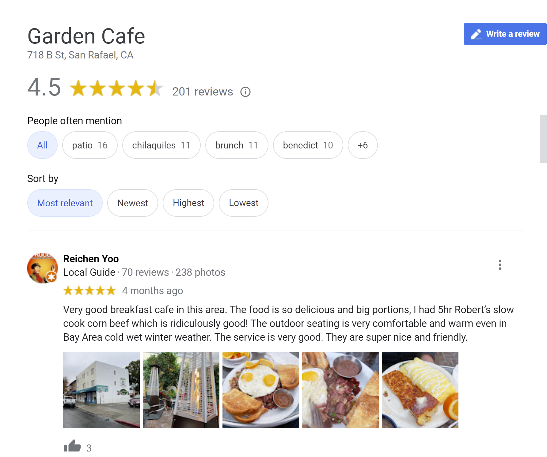 Then, analyze the sentiment of the two bodies of reviews and note down whether reviews are mostly positive, neutral, or negative. While you are doing so, look at the place topics labeled “People often mention” (see screenshot, above) and write those down to see if your competitor is earning good mentions of aspects of their business which you have yet to earn.