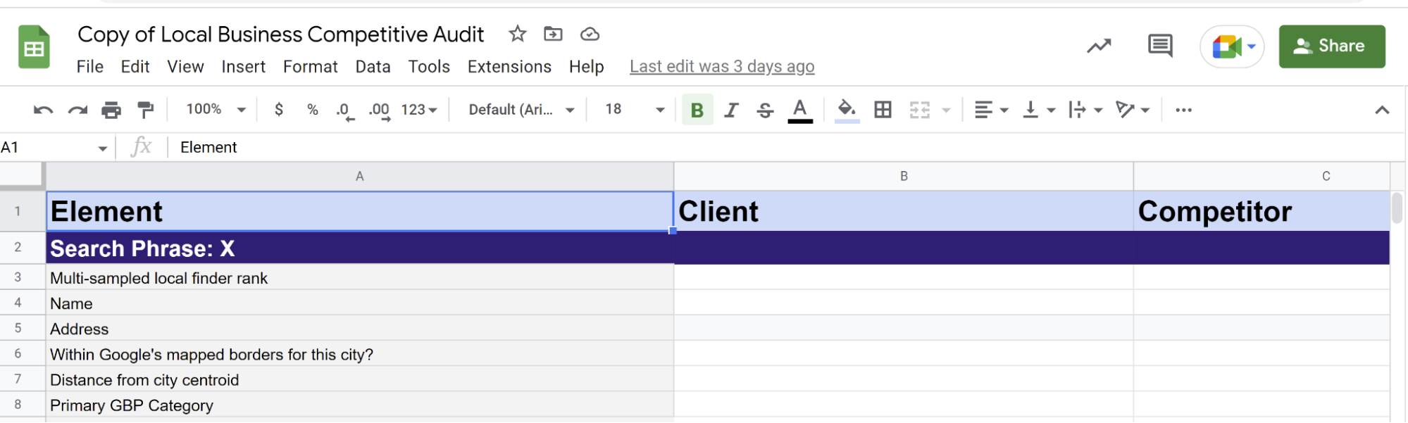 Today, I’ll teach you to assess 50+ factors and provide you with a free, copyable spreadsheet to fill out to help you discover how the business you’re marketing can reach the level of its top local competitor. I’ll provide an illustrated tutorial of each field in the sheet, and I’ll also cover how to use what you learn to create strategy, differentiation, and a philosophy for competition that exists within the positive framework of localism.