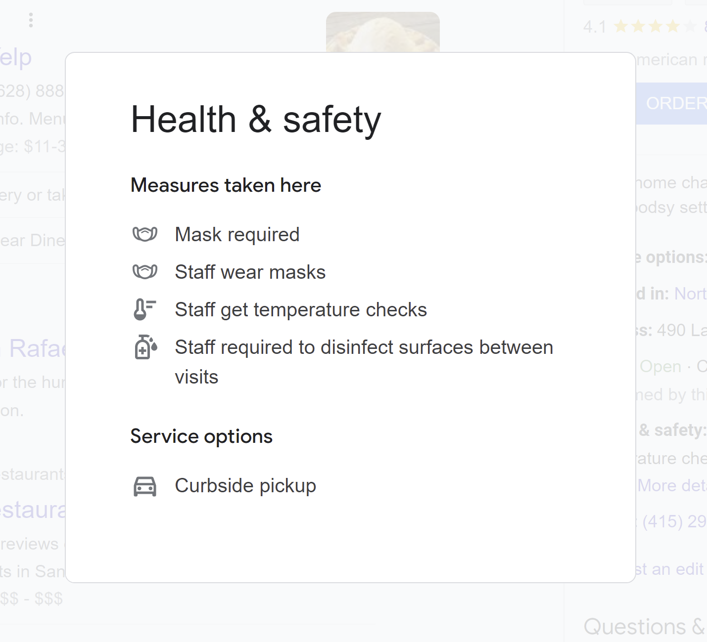 There are multiple types of attributes which can appear in different areas of the Google Business Profile, in profile overlays, and on Google Maps. For example, our screenshot shows safety and service attributes, but other possibilities include attributes like “Black-owned”, “Wheelchair accessible” or “Late-night food”. Attributes can be the result of information a business has given directly to Google in creating their listing, or feedback Google intakes from the public. Rather than this row in your spreadsheet having a clear winner, use the notes section to record any positive attributes your top competitor has that you would also like to have.