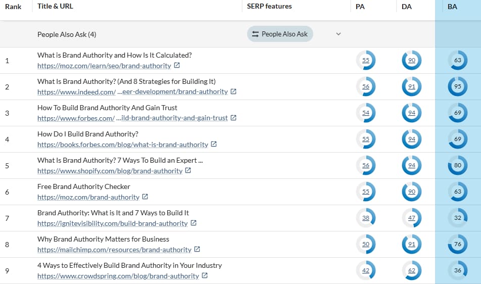 To help you put Brand Authority to work, we’ve added it to three product features. First, the SERP Analysis section of Keyword Explorer now shows Brand Authority scores for each organic result for that keyword (alongside Domain Authority and Page Authority):