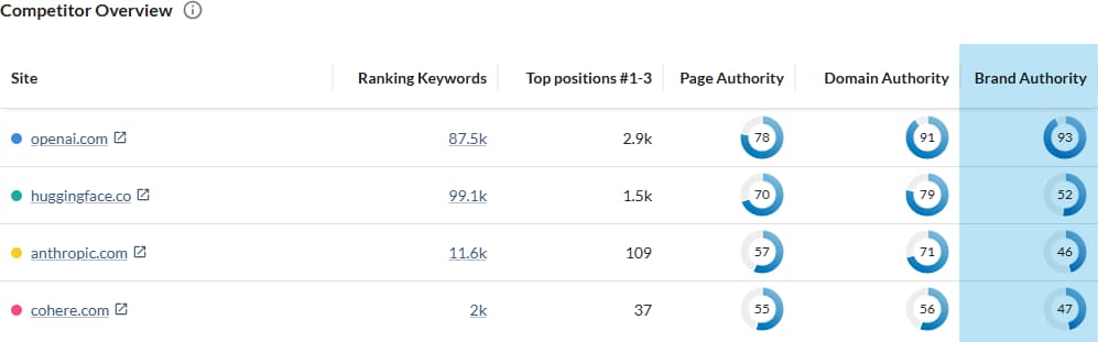 In our revamped Keyword Gap tool (under Competitive Research), we’ve also added Brand Authority to the Competitor Overview table, giving you a quick look at how you measure up against your competitors on key metrics.