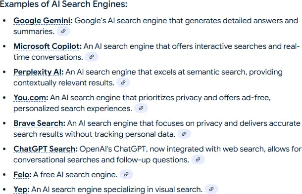 Finally, the advent of AI/LLMs is shifting how we view search results and have made brand mentions a growing form of search visibility. Consider this excerpt from an AI Overview on a Google search for “AI search engines” …