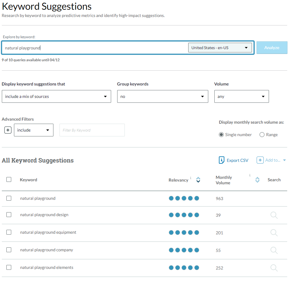 When I am not able to find more intents in Google Search Console I will add data from third party tools such as Moz Explorer. Here I have inserted the keyword “Natural playground” in the suggestion box, and a list of relevant keywords appear.