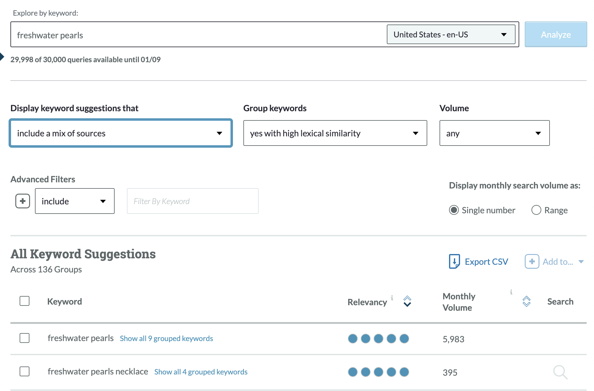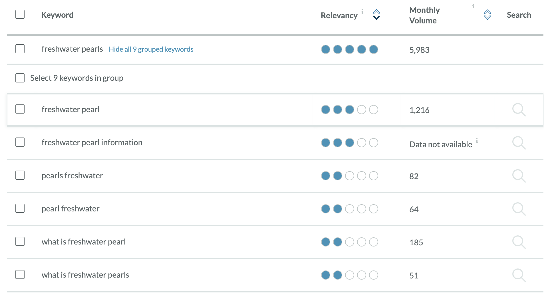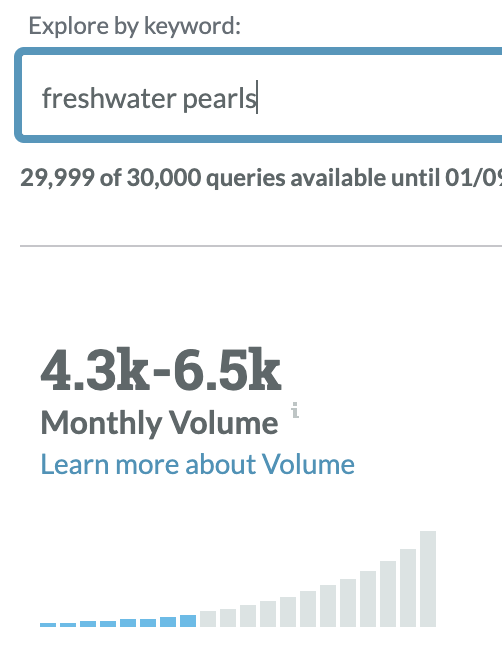 Now try "freshwater pearls." As expected, the search volume goes down, but we’re getting more specific.
