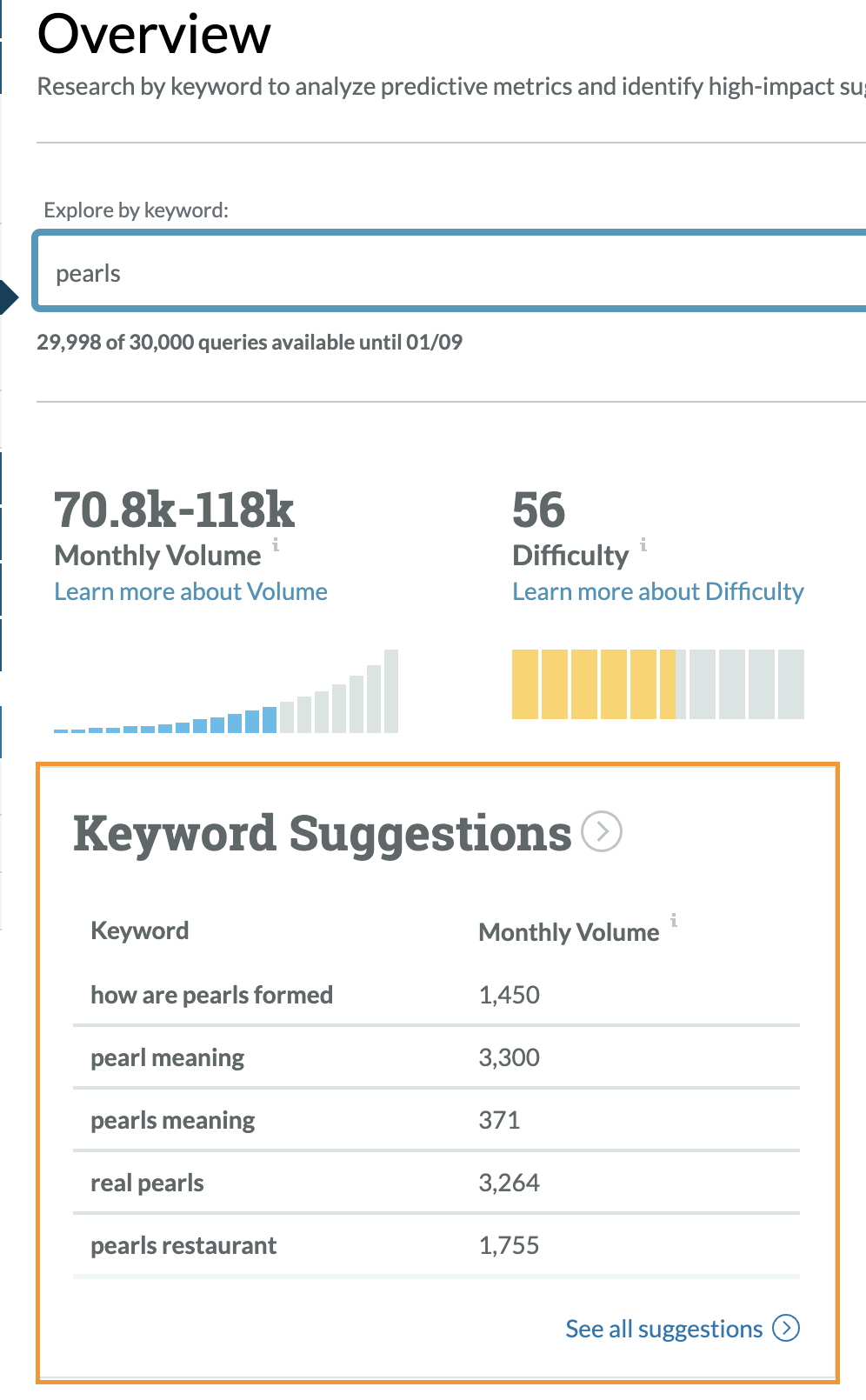 To start, enter a broad industry keyword. In my case I’ll type in "pearls" into the Keyword Explorer search box. Now you can see Moz’s Monthly Volume displaying how often a term or phrase is searched for in Google: