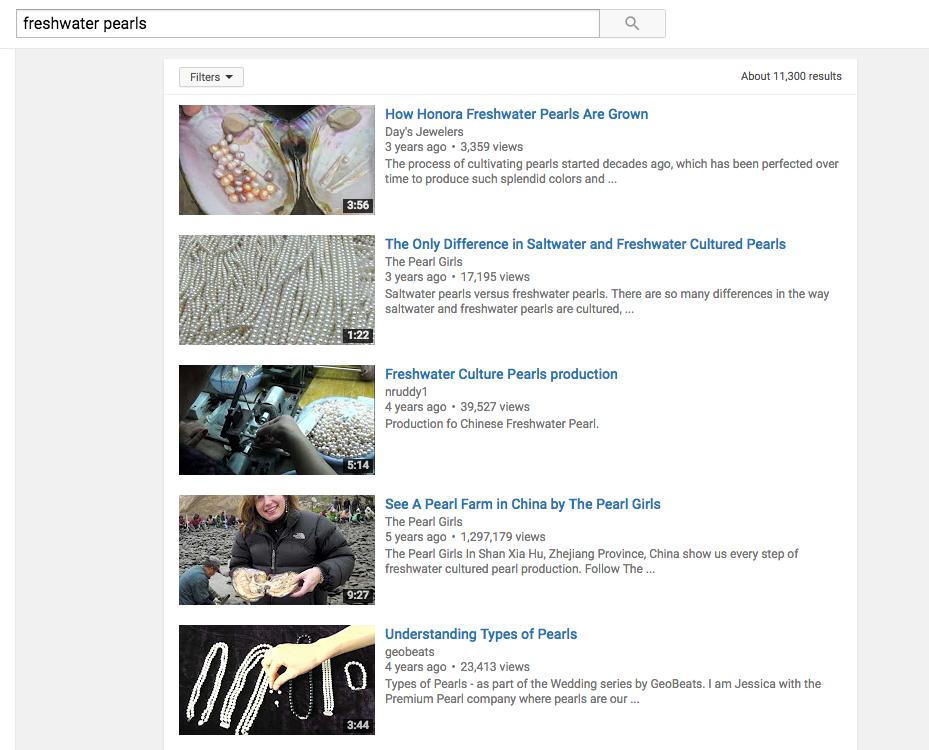 This sort of information is offered up by big retailers who have created content that targets the intention of searchers. Mikimoto drives us to their blog post all about where freshwater pearls come from.