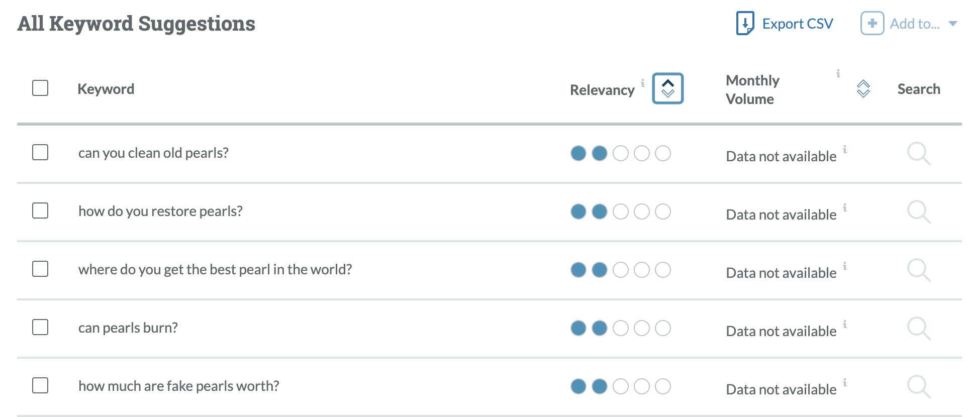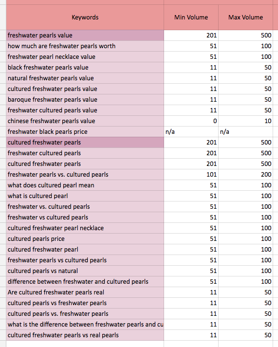 I’m also interested in the words around "price" and "value," so I’m doing the same and saving those to my sheet, along with the search volume. A few attempts at researching the "cleaning" of pearls wasn’t very fruitful, so I’ve adjusted my search to "clean freshwater pearls."