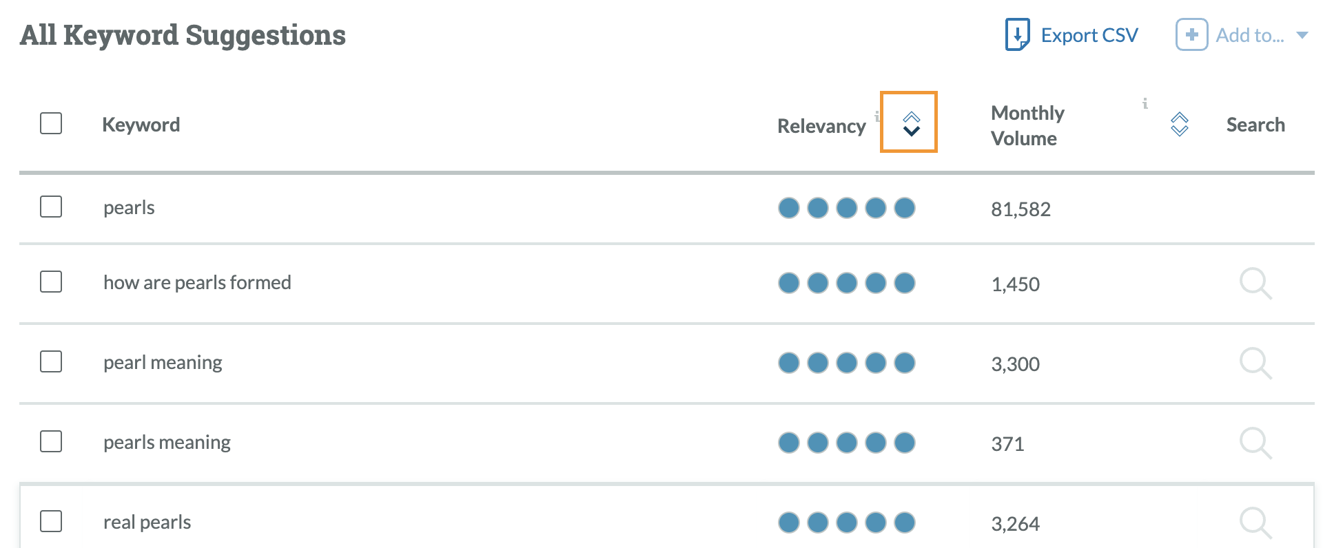Well, hi there, ever-expanding long tail! We’ve gone from a handful of keywords pulled together manually from different sources to 1,000 suggestions right there on your screen. Positioned right next to that, search volume to give us an idea of demand.