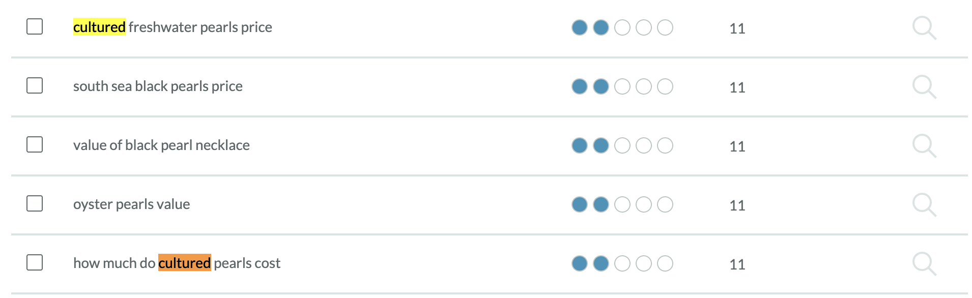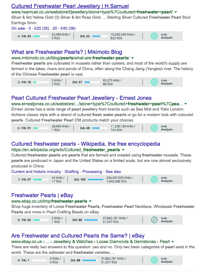 Now this is starting to look interesting: we’ve got some keyword modifiers, some clear buying signals, and a better idea of what people might be looking for around "freshwater pearls."