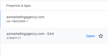 Click “Open” on the property where you want to track events, as shown in the below image, or create a new property if needed.