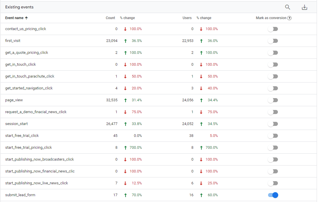 For example, here are all the conversion tracking events established on a particular website. In this case, only form submissions are tracked as a conversion, which is the most valuable event for this B2B company.