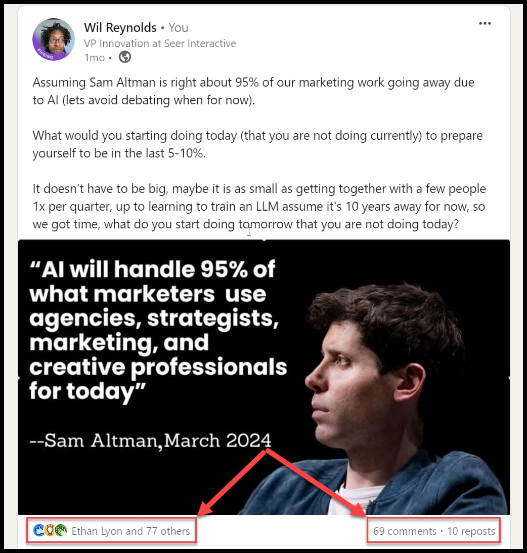 In a world where there is just WAY too much average content already, and with AI likely just making the problem worse, people are looking more than ever for their networks to help them. I want to build content that gets more and more social. Once I see on social media that this thing takes off, now I know it's worth doing more optimization to the post because humans, not proxies for humans, said… “this is valuable.”