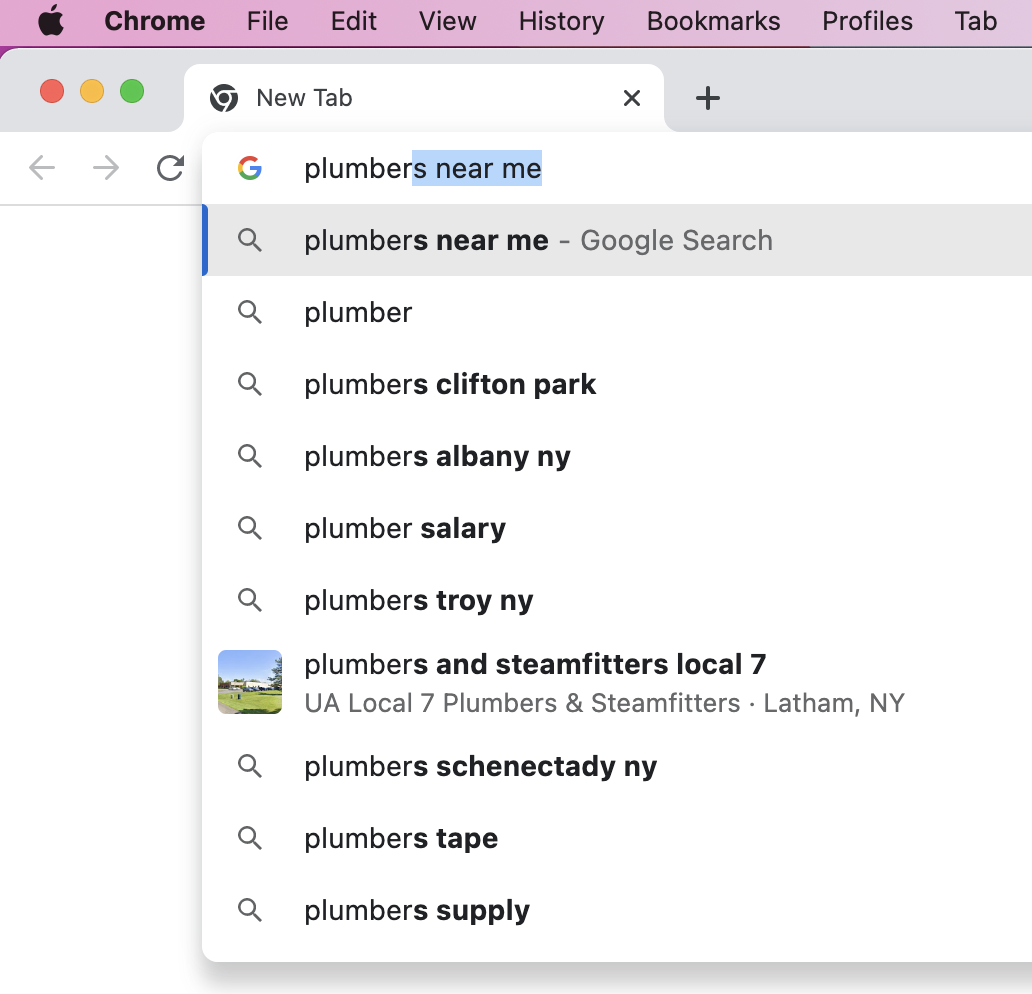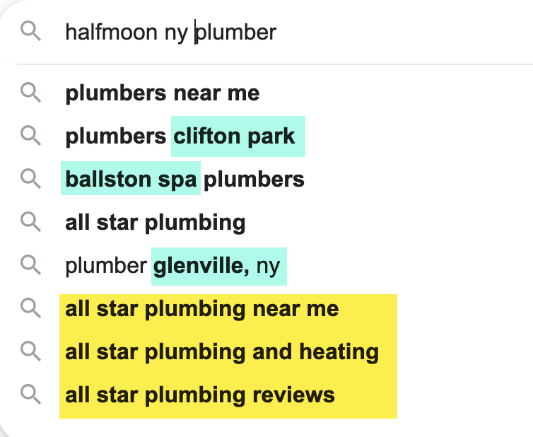 In this case, a plumber located in Halfmoon, NY will know that they need to have pages targeting Clifton Park, Ballston Spa, and Glenville. They will also find a distinct local competitor to keep an eye on.