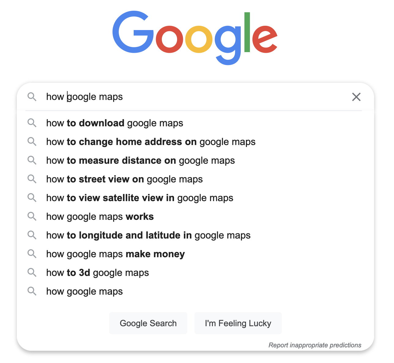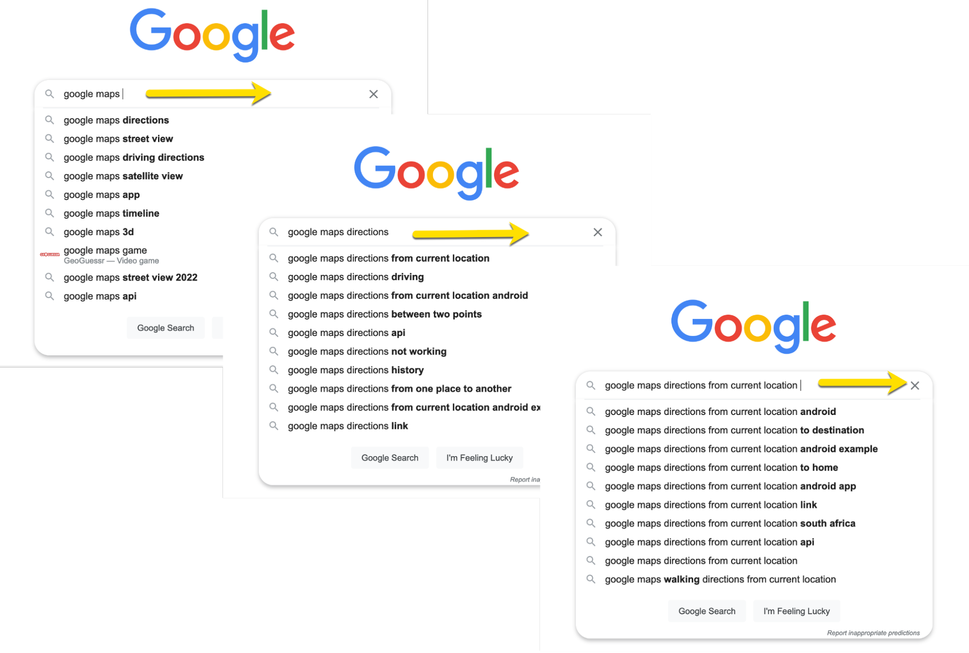 Google Autocomplete is perfect for discovering more specific and relevant phrases that searchers are using to solve problems or answer questions, as it extends your search query as you type it. If your query is searched a lot, Google will continue extending it further and further — just keep hitting space at the end of each query: