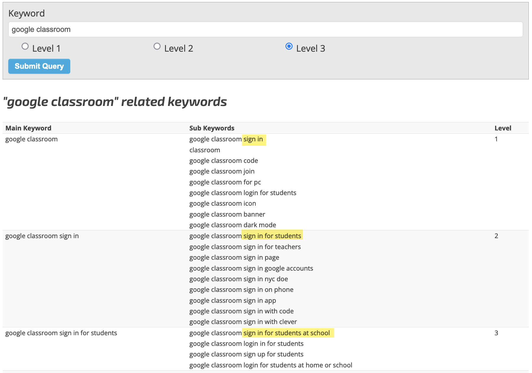 While you can do this by using the search box itself, you can also use tools like Suggestion Keyword Finder to make it easier and faster, , as it extends each of your chosen terms deeper to level three: