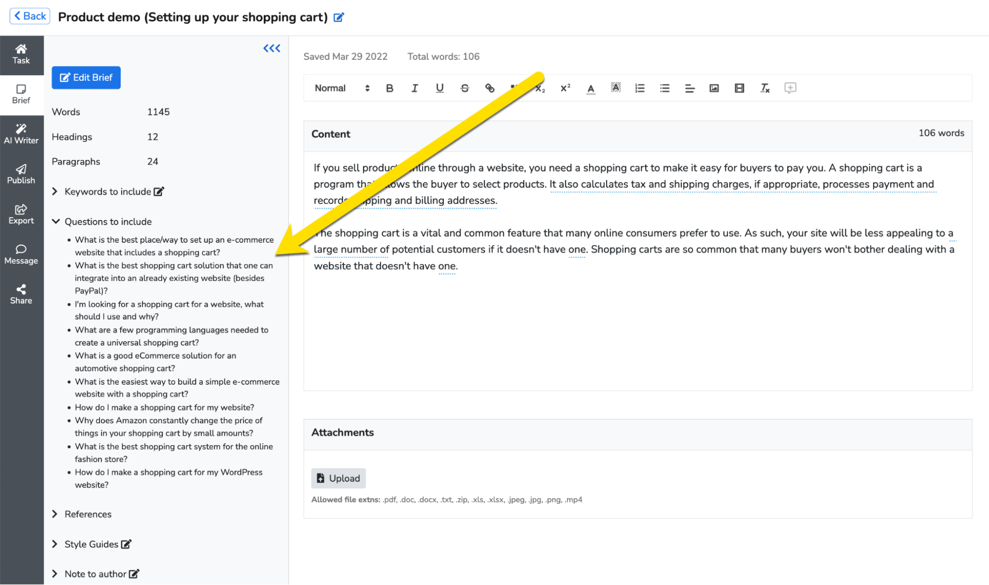 Narrato is a handy content creation and collaboration platform allowing you to import these questions and integrate them in your content brief and content itself: