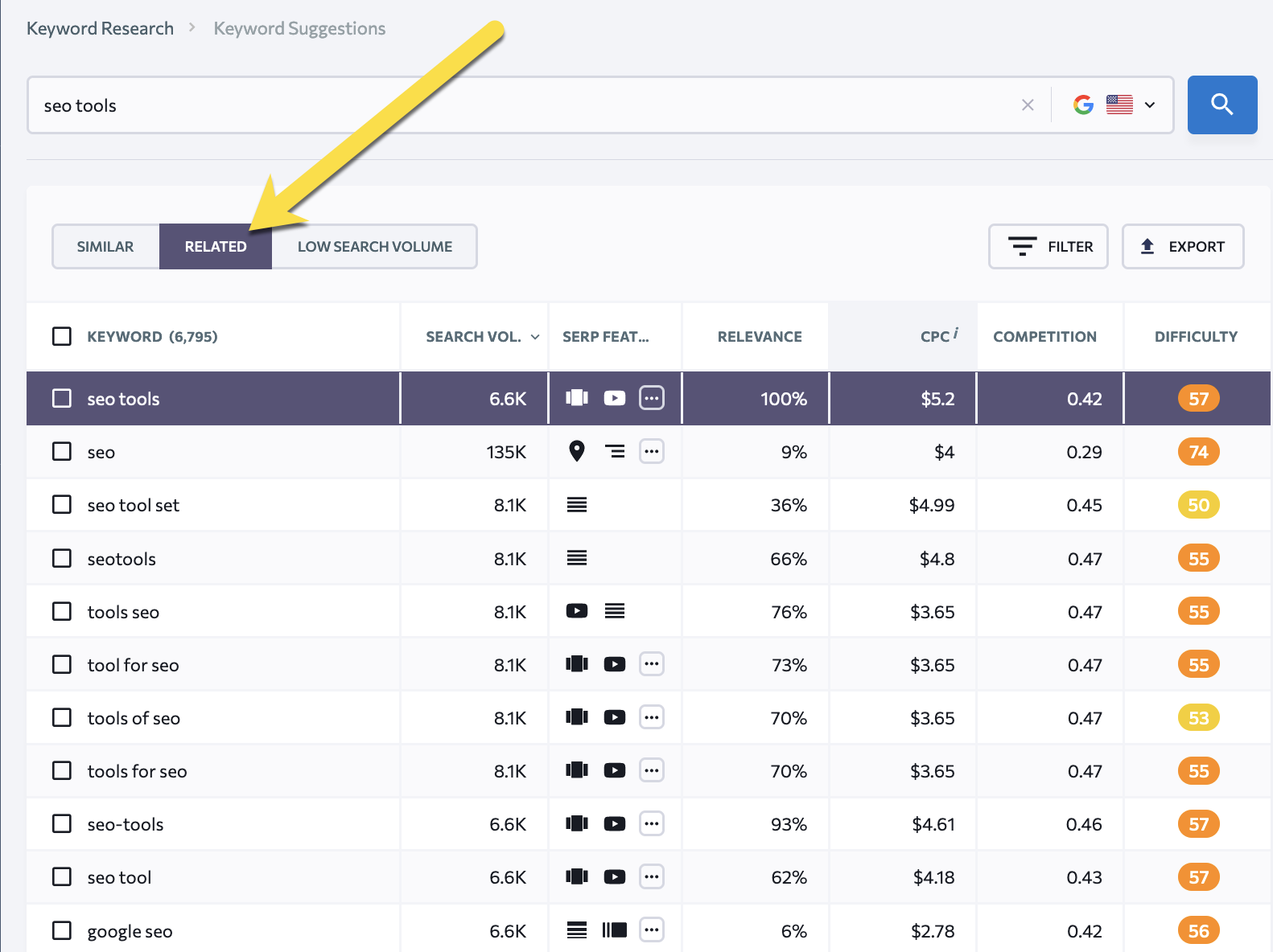 SE Ranking uses search refinements to identify related keywords you’d want to include into your SEO strategy: