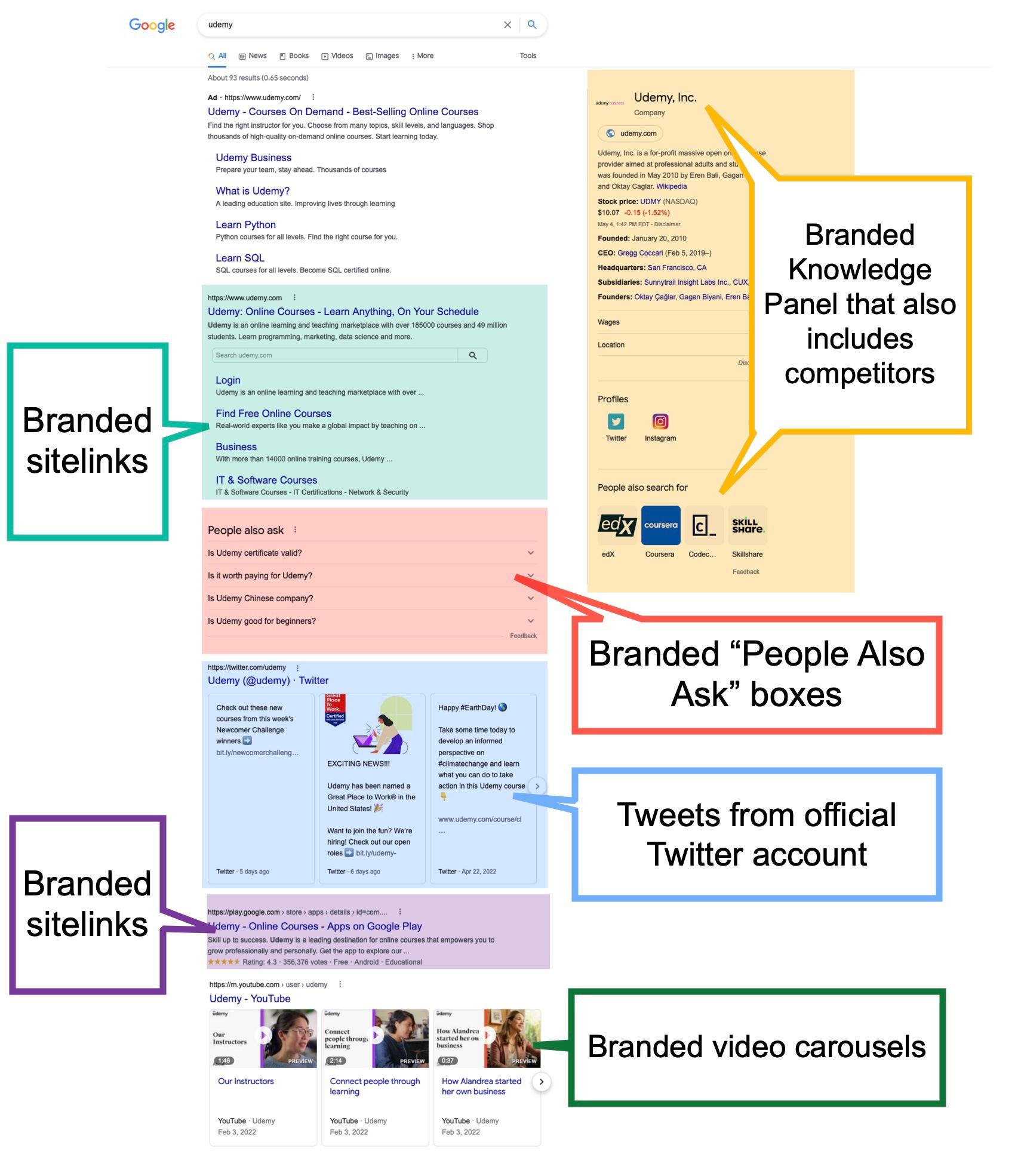 Branded SERPs often include image and video carousels, People Also Ask boxes, tweets from the brand’s official account, and more. A well-organized reputation management strategy should target all of these search sections and elements.