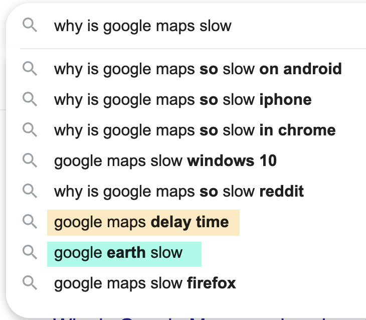 For example, if you search for [why is google maps slow] and put your cursor anywhere inside your query in the search box, Google Autocomplete will try to help you specify the problem by suggesting [delay time] instead of [slow] and making sure you really mean [maps] and not [google earth slow].