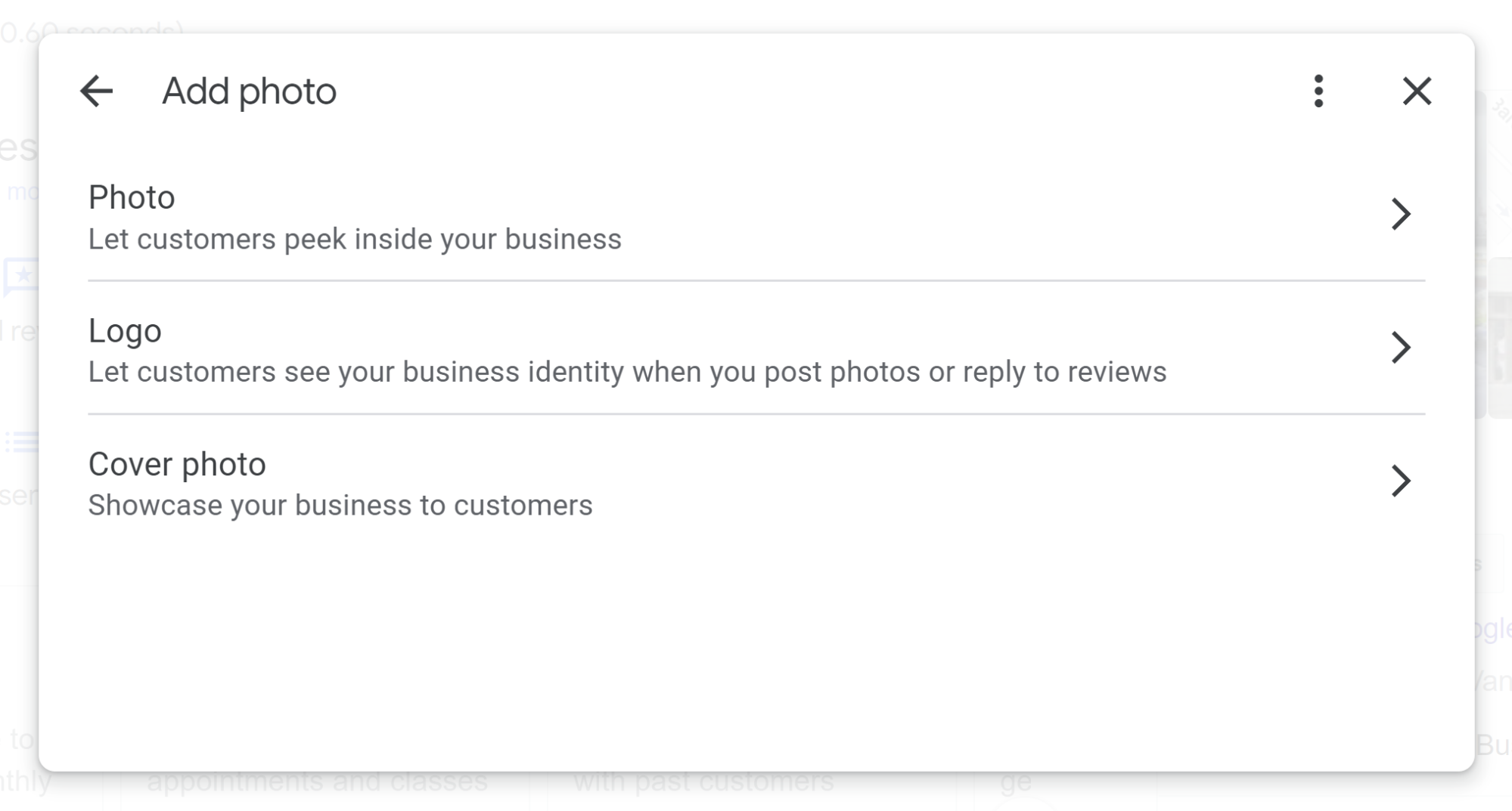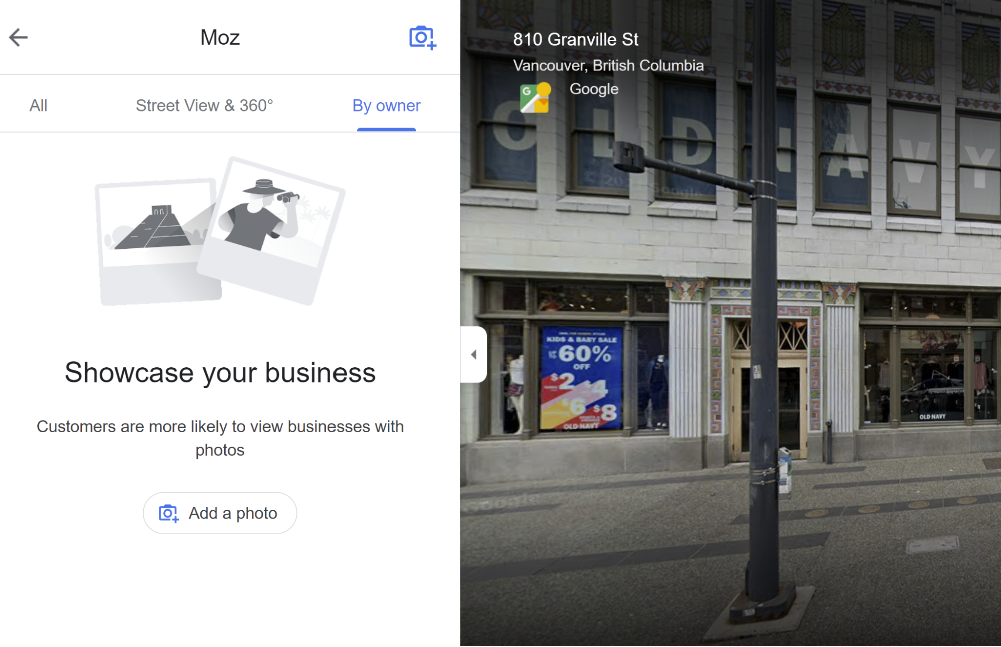 When clicked on, this takes the public to an interactive Google Street View visual of the business. When you are logged in, clicking on the feature takes you to this interface for uploading your own exterior imagery: