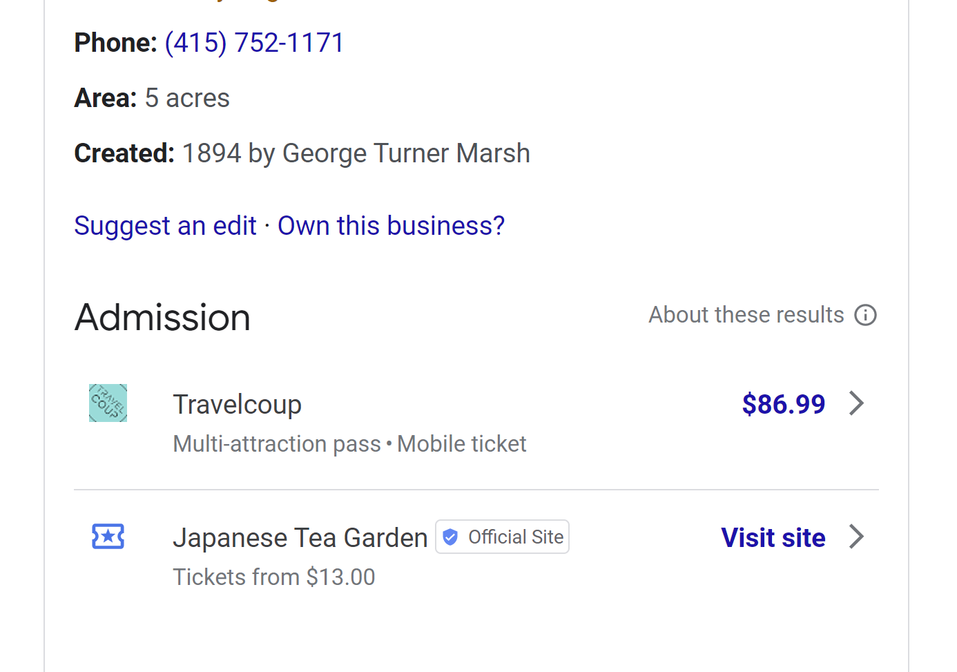 However, as can be seen in my above example of the GBP of the Japanese Tea Garden in San Francisco, the official website of the attraction is being outranked in the Admissions results by an entity that is not official and is also more expensive, contrary to Google’s statement of how this feature should work.