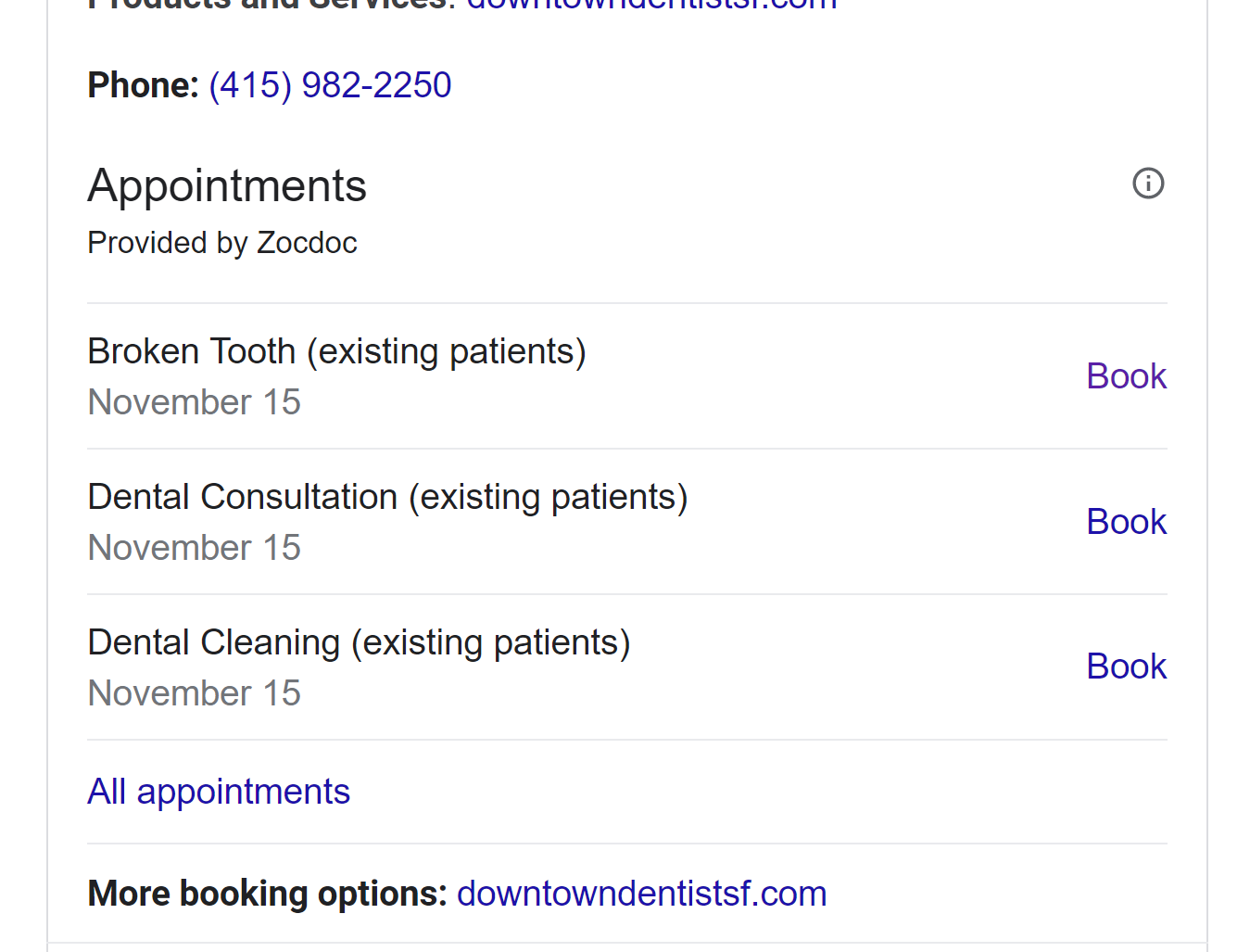 Businesses can feature several different booking and appointment functions on their listings, powered by a provider. For example, this instance on the listing of a dental practice stems from ZocDoc: