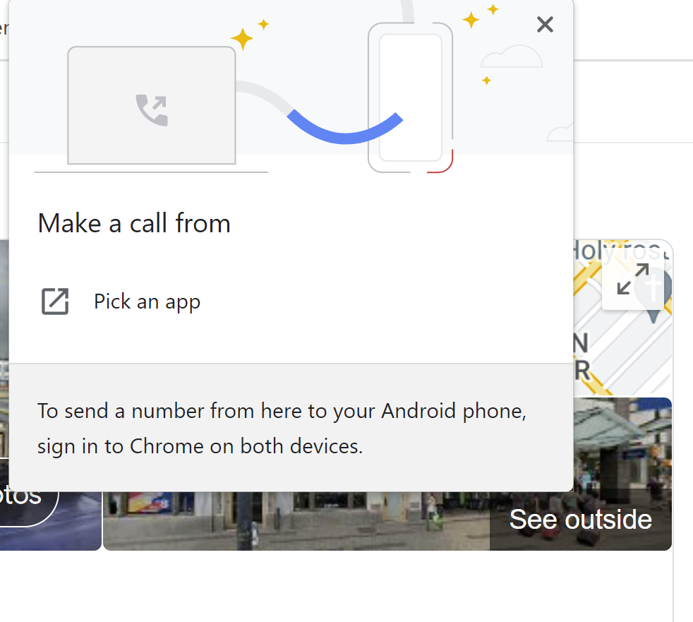 On mobile devices, clicking the “call” button automatically triggers a phone call to the business. On desktop, it brings up this popup asking the user to pick an app with which to start the call.