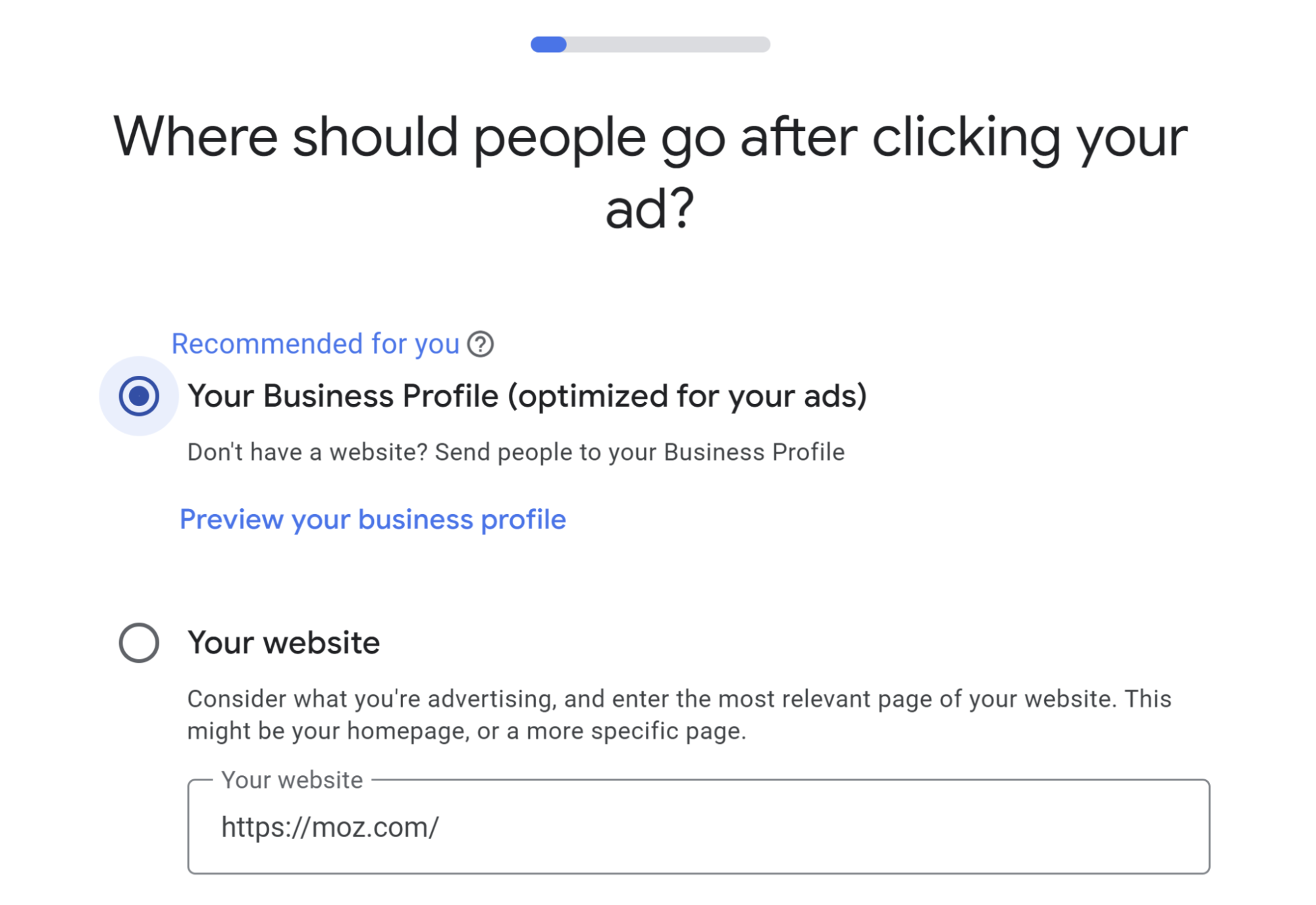 This link takes you to whichever page of your website you’ve designated as the Google Business Profile landing page.