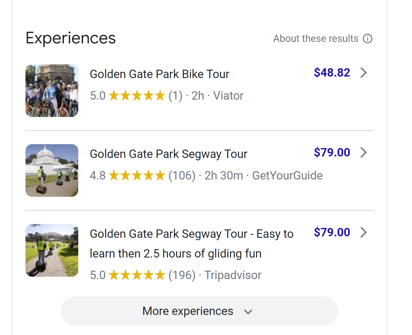 Some Google Business Profiles may included nearby experiences. This screenshot is also from the GBP of the Japanese Tea Garden in San Francisco, and is displaying other things to do in Golden Gate Park.