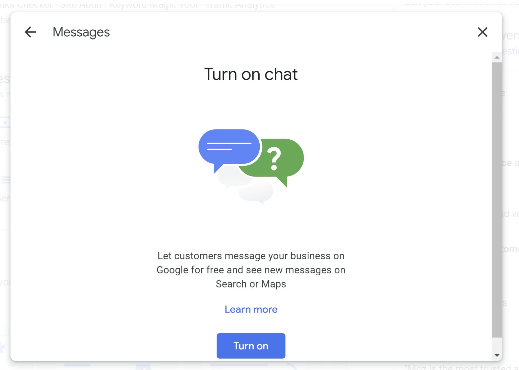 Where to control? Google’s branding of this feature is messy. In the NMX it is labeled Messages, but when opting into the program, you will be shown a popup asking if you want to turn on “chat”, and customers will see buttons labeled “chat”. You can read more about this feature here.