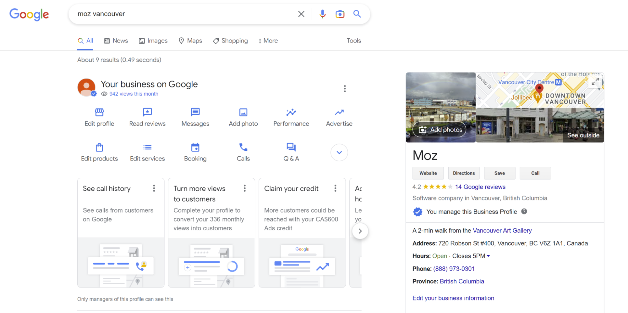 When clicked on, this takes the user to both owner and user-generated photos in a set. Photos significantly impact CTR. Photos must be monitored for spam. You can also upload videos to your photos section, but try to post more than 2 videos so that you’ll get a separate mobile video subtab. It’s also important to know that previous versions of Google’s local product offered an analytical feature called “Photo Insights” but this no longer exists in the NMX.