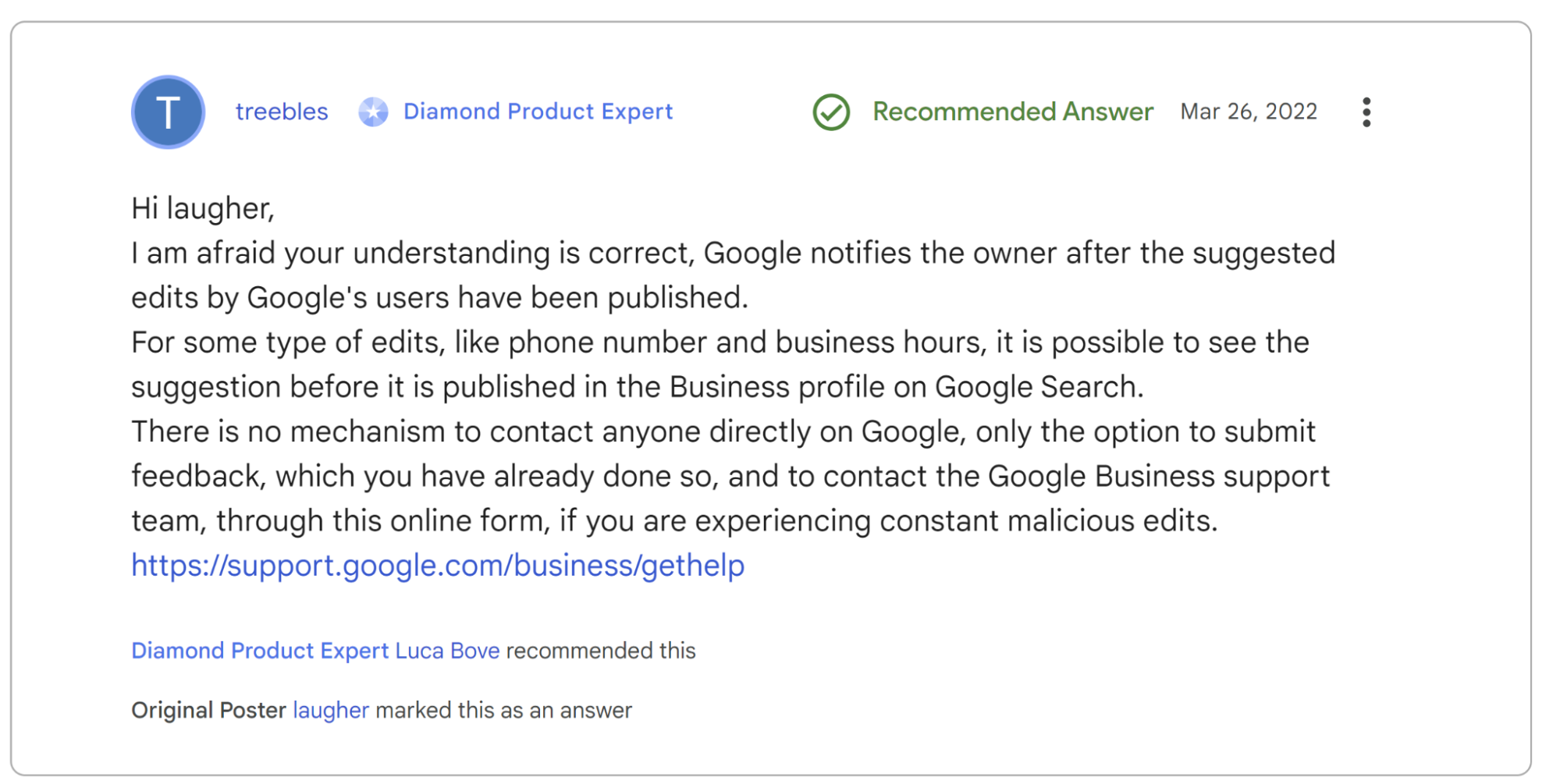 No. Unfortunately, the suggest an edit feature is a cause of confusion and stress for many local business owners who have no control over whether or not members of the public suggest edits to listings. The difficulty of the scenario is summed up well by this Diamond Product Expert in Google’s help forum: