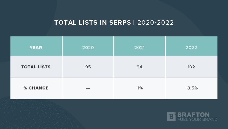 Determined whether more lists are showing up in 2022, 2021, or 2020 SERPs. I simply counted the number of “lists” in the SERP in 2022 and compared it to the years prior.