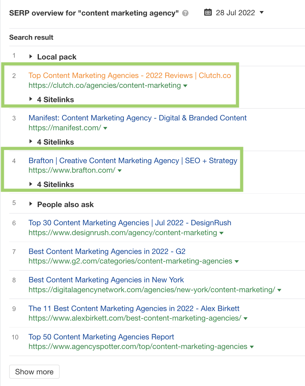 For our purposes, we’ll define a “list” as any Google search result that compares, ranks, or evaluates multiple businesses. An example is something like, “8 best coffee grinders of 2022.” A Clutch directory listing for “Top Content Marketing Agencies” would also apply.