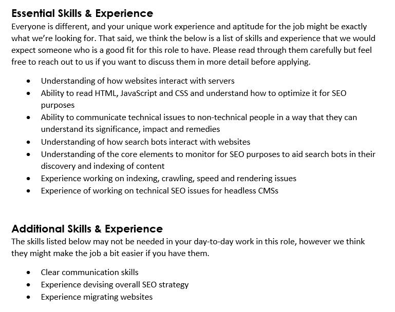 Remember that it’s hard to hire an SEO who is a phenomenal all-rounder. Most of us have our leanings towards tech, content, digital PR, etc. That said…