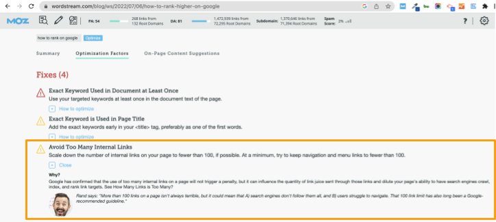 Tip: Keep in mind that this tool will count ALL links found on the page, including those in your main navigation and footer, so the “Too Many Links” warning could be a false positive.